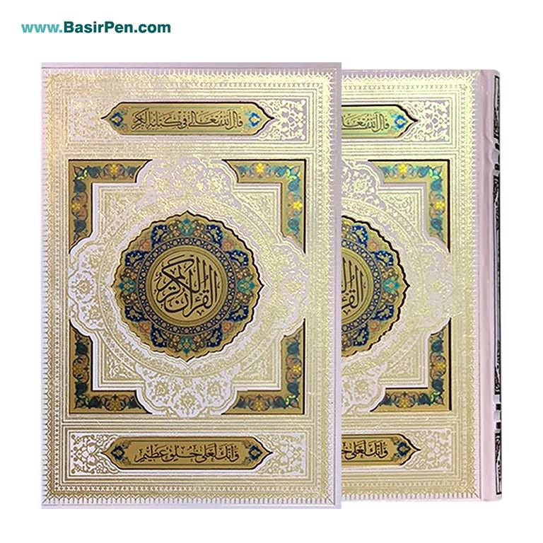 کتاب نفیس قرآن سفید (قرآن عروس) بصیردارای پلاک طلایی با چاپ تذهیب رنگی بسیار زیبا همراه با طلاکوب کاغذ گلاسه لبه طلا خط عثمان طه همراه با ترجمه فارسی و چاپ کاملا رنگی در قطع وزیری با طرح بسیار زیبا، هدیه کاملا نفیس و زیبا و مناسب جهت استفاده در مراسم عقد و ...
