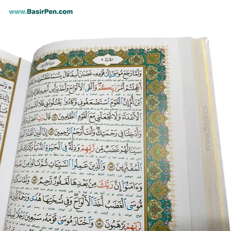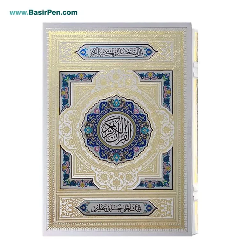 کتاب نفیس قرآن سفید (قرآن عروس) بصیردارای پلاک نقرهای با چاپ تذهیب رنگی بسیار زیبا همراه با طلاکوب کاغذ گلاسه لبه طلا خط عثمان طه همراه با ترجمه فارسی و چاپ کاملا رنگی در قطع وزیری با طرح بسیار زیبا، هدیه کاملا نفیس و زیبا و مناسب جهت استفاده در مراسم عقد و ... توجه: این کتاب توسط موسسه فرهنگی بصیر به چاپ رسیده و قابلیت قرائت با انواع قلم قرآنی سری جدید موسسه بصیر را دارد.