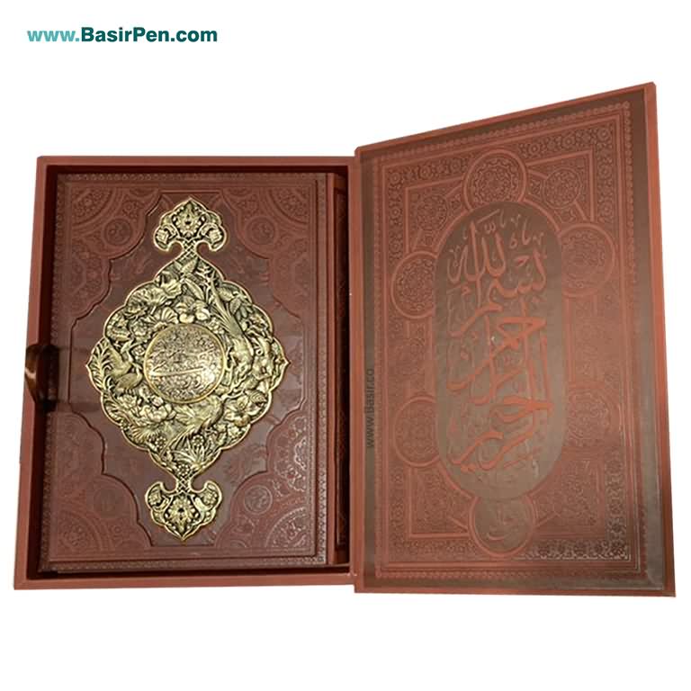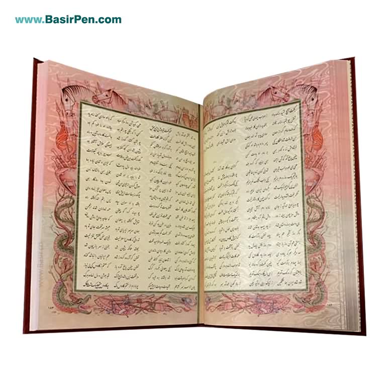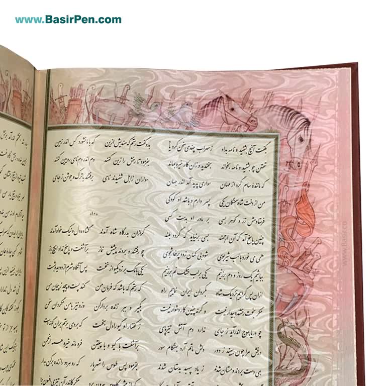 کتاب نفیس شاهنامه چرمی در قطع بزرگ سلطانی همراه با جعبه (قاب بازشو)با کاغذ معطر مارگانو طرح ابرو باد و تذهیب های بسیار زیبا رنگی جلد و قاب چرمی (ترمو) همراه با طرح زیبا بر روی مس به صورت برجسته