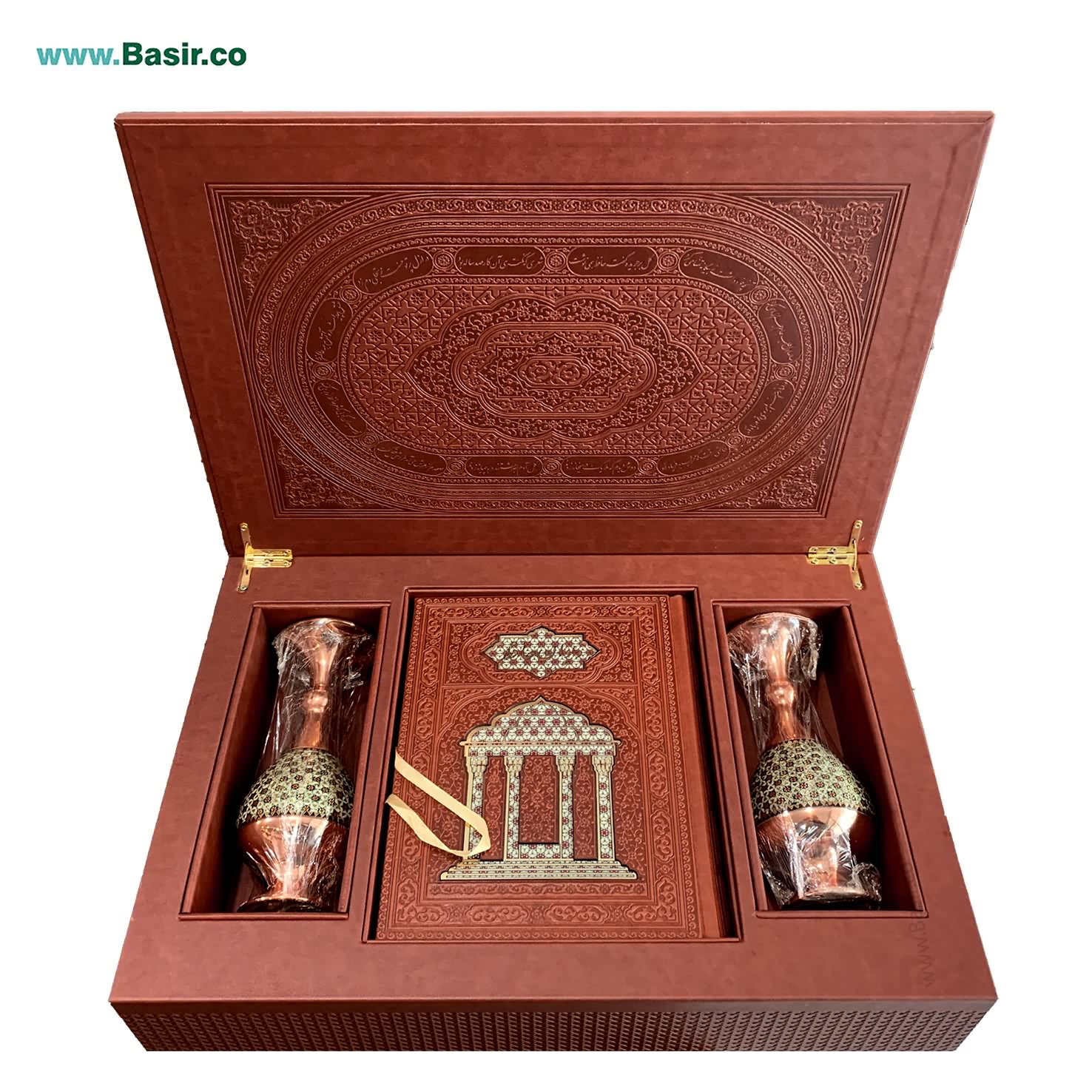 مجموعه نفیس و بسیار زیبا کتاب دیوان حافظ نفیس لبه تصویر همراه با جعبه لپتاپی چرمی و دو گلدان خاتم بسیار زیبا که با طرحی فوق العاده و چشم نواز تولید شده است. این مجموعه شامل یک کتاب نفیس دیوان حافظ در قطع وزیری با کاغذ گلاسه و تذهیب زیبا در داخل جعبه با دو گلدان بسیار زیبا خاتم در اطراف کتاب طراحی شده و هدیه ای بسیار نفیس و ماندگار به شمار می رود. این مجموعه توسط این مرکز (انتشارات نوین بصیر) با تخفیف های عالی در سراسر ایران توزیع می گردد.