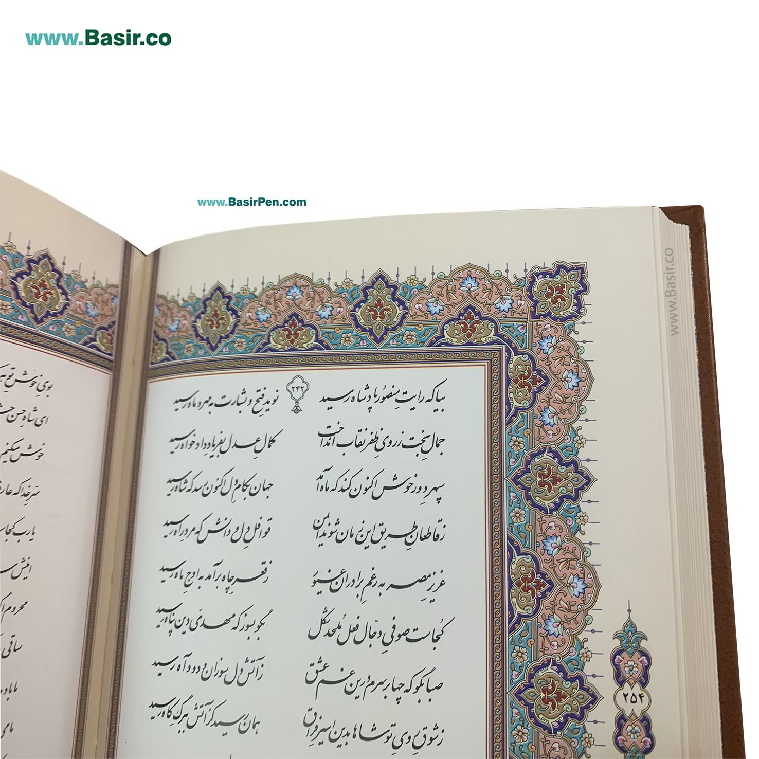 کتاب نفیس دیوان حافظ چرمی همراه با قاب کشویی طرح برجسته با کاغذگلاسه و خط نستعلیق زیبا با چاپ کاملا رنگی و تذهیب بسیار زیبا در قطع رقعی هدیهای نفیس و ماندگار برای تمامی افراد با قیمت مناسب که به صورت تک و یا در تعداد بالا با تخفیفهای ویژه توسط این موسسه در سراسر ایران توزیع می گردد.