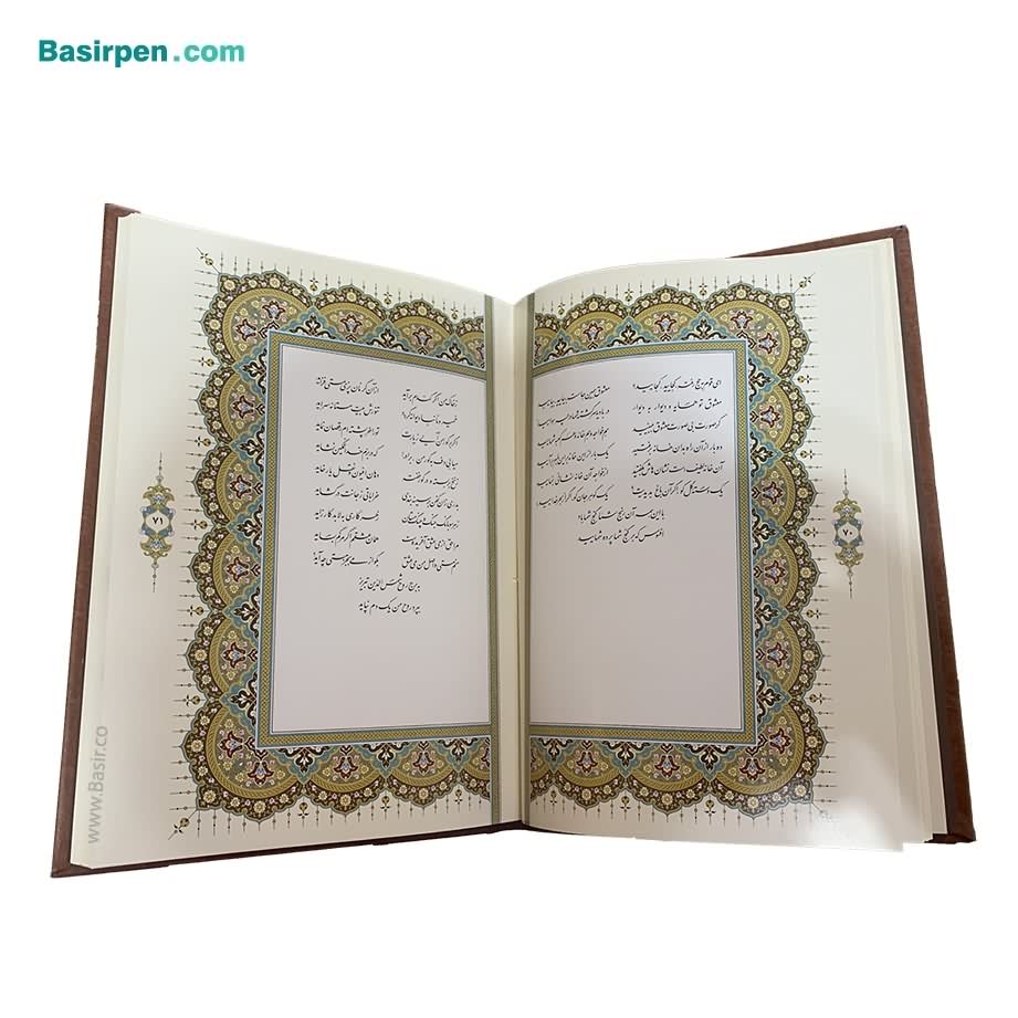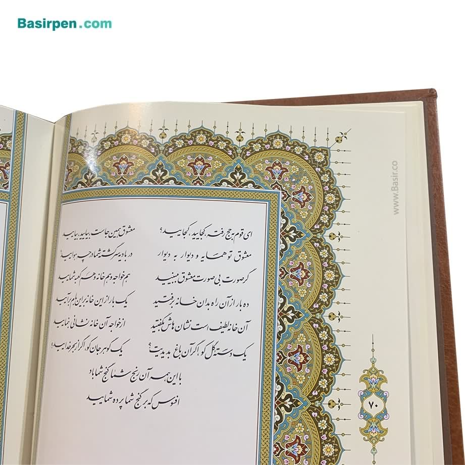 کتاب نفیس غزلیات شمس همراه با قاب کشویی طرح چرم و مس برجسته همراه با تذهیب بسیار زیبا و چاپ کاملا رنگی بر روی کاغذ گلاسه هدیه ای نفیس و ارزشمند که توسط انتشارات نوین بصیر به صورت تک و یا در تعداد بالا با تخفیف های ویژه ارائه می گردد.