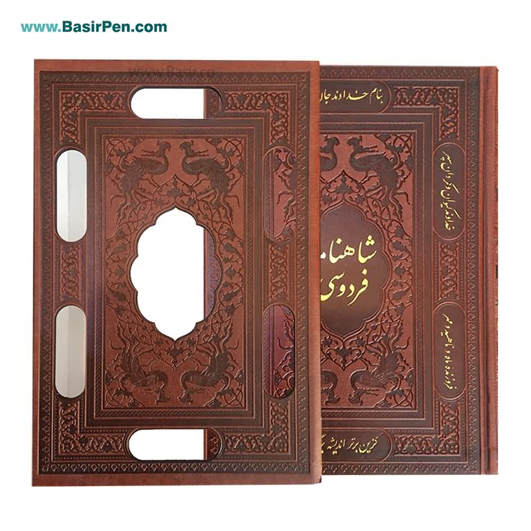 کتاب شاهنامه نفیس سروده ابوالقاسم فردوسی همراه با قاب کشویی جلد و قاب طرح چرم (ترمو) بر اساس نسخه مسکو در 1592 صفحه به صورت کامل
